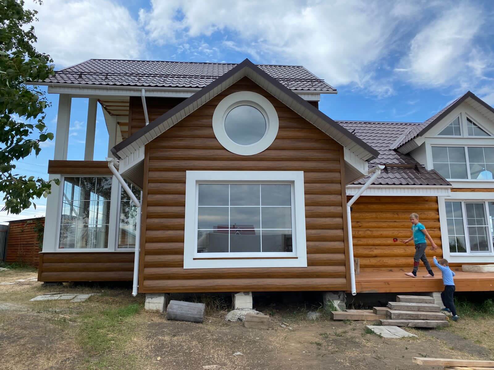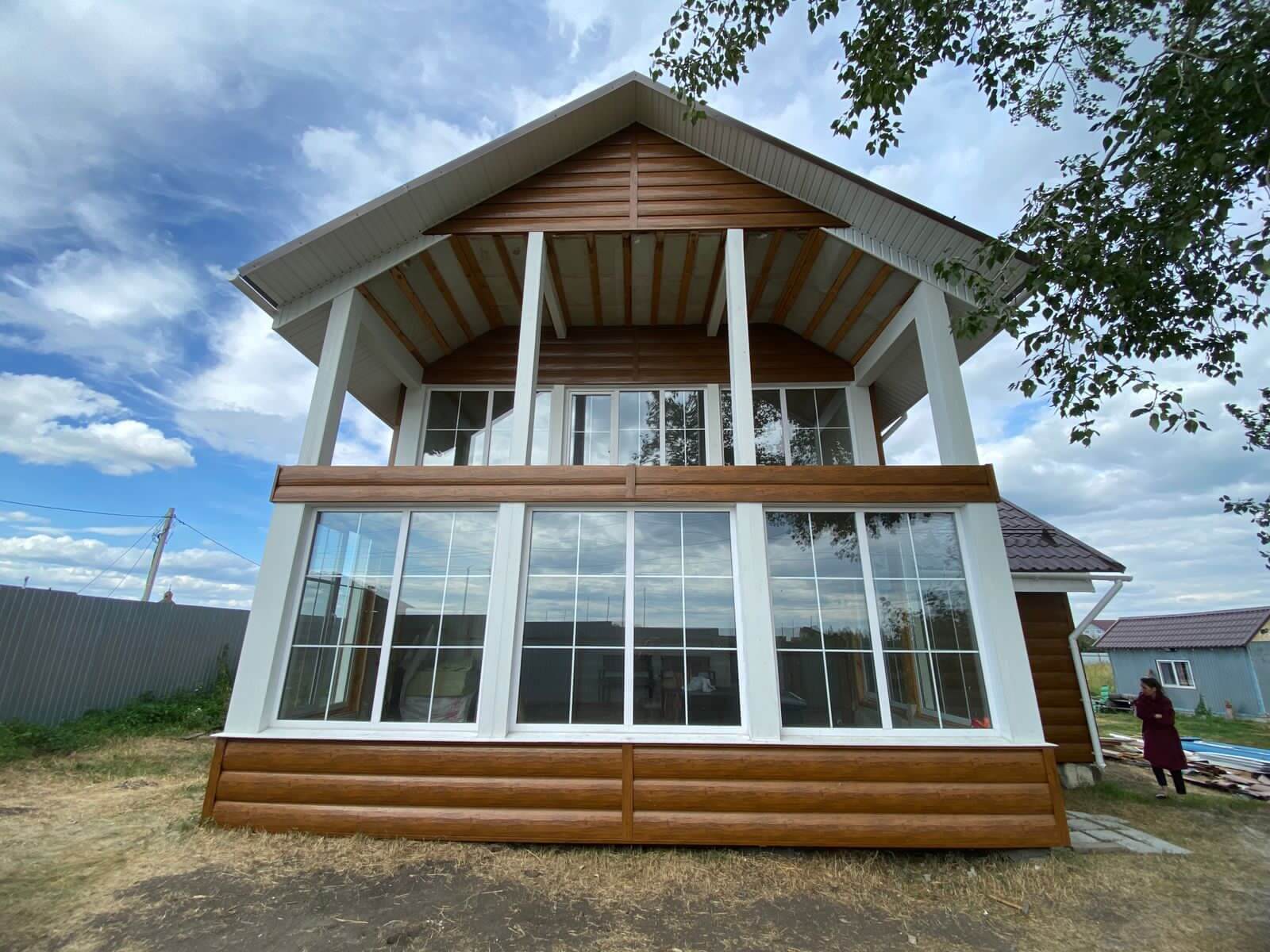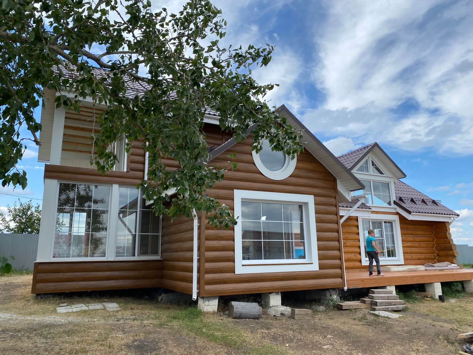 Еще один безупречно выполненный объект — фасад из "Царьсайдинга" (Бревно рубленое 4Д) в оттенке под дерево "Орех"
