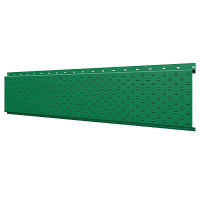 Линеарная потолочно-стеновая панель с ПЕРФОРАЦИЕЙ для вентиляции цвет RAL6029 Зеленая Мята применяется в качестве софитов для подшивы крыши, наружной и внутренней отделки потолков, стен, фронтонов фасада дома в Туле.