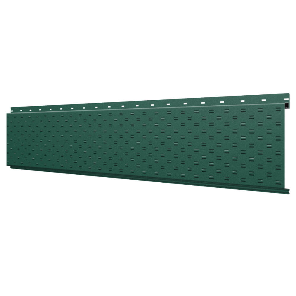 Линеарная потолочно-стеновая панель с ПЕРФОРАЦИЕЙ для вентиляции цвет RAL6005 Зеленый Мох Стальной Бархат применяется в качестве софитов для подшивы крыши, наружной и внутренней отделки потолков, стен, фронтонов фасада дома в Туле.