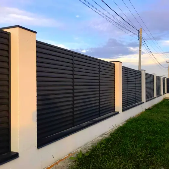 Двусторонний горизонтальный секционный забор из ламелей «Реснички» в одностороннем покрытии 7024 MATTЕ Серый Графит матовый. Конструкция отличается современной эстетикой и прочностью, а особым преимуществом является увеличенная ширина секции – до 4.6 метра, что обеспечивает цельный аккуратный вид и минимизирует количество опор. Такое решение подходит как для частных участков, так и для коммерческих объектов, подчеркивая стиль архитектуры и обеспечивая надежную защиту территории.