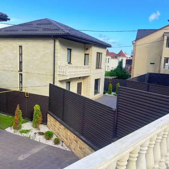 Горизонтальный секционный забор с ламелями Реснички в цвете RAL 8019 МАТТЕ Тёмный Шоколад выглядит стильно и современно. Матовая поверхность придаёт ограждению благородную глубину, а двусторонняя конфигурация ламелей обеспечивает безупречный вид с любой стороны. Такой забор не только надёжно защищает территорию, но и становится эффектным элементом ландшафтного дизайна, подчёркивая вкус владельцев. Идеальное сочетание функциональности и эстетики!