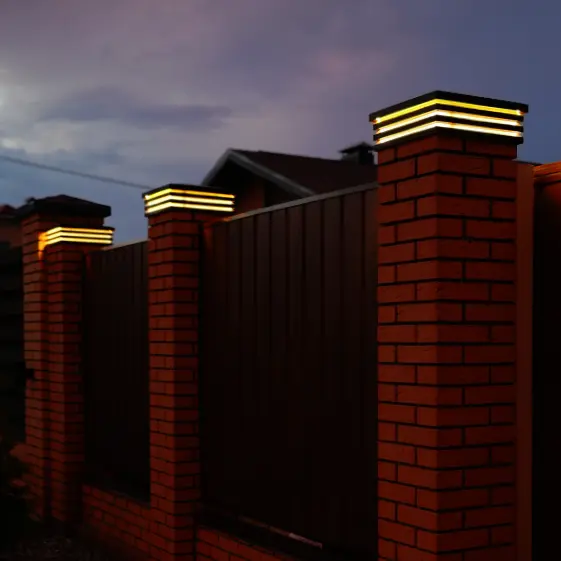 Колпак Bona ХайТек в тёплом коричневом оттенке органично завершает столбы кирпичного забора: чёткие современные формы и аккуратная поверхность подчёркивают фактуру кладки и придают ограждению солидный, технологичный вид. Встроенная неоновая подсветка мягко обводит контур колпака, эффектно выделяя силуэт столбов в сумерках и создавая приятную атмосферу вдоль периметра.