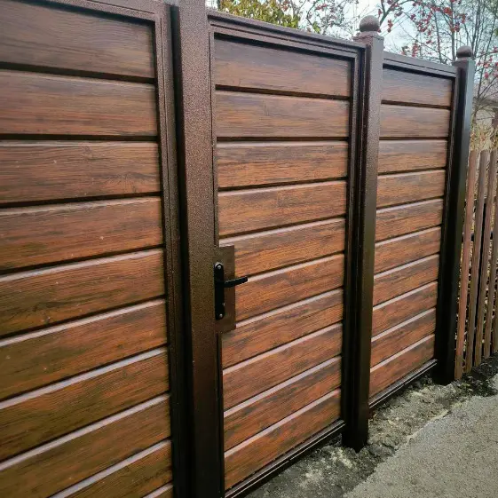 Представьте двор, который сразу привлекает внимание своей безупречной эстетикой и надежностью: изящный палисадник из евроштакетника гармонично сочетается с современным горизонтальным секционным забором из металлического сайдинга «Евро-Брус» в благородном оттенке «Античное дерево» с 3D-покрытием Printech. Такой забор не только подчеркивает статус и вкус хозяев, но и служит долговечной защитой территории. Ваш участок будет выглядеть стильно, ухоженно и современно — готовое решение, которое вдохновляет каждый день.