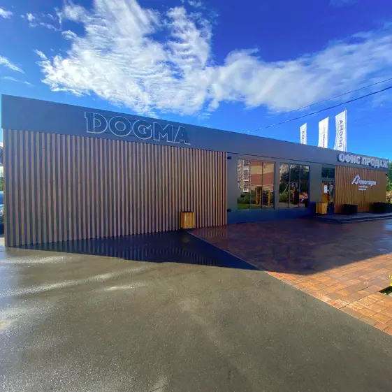 Фасад офисного здания оформлен с применением кубообразной рейки под дерево «Кипарис» Printech (Корея) собственного производства, покрытие обладает высокой стойкостью к выцветанию и атмосферным воздействиям, что гарантирует долгий срок службы и сохранение безупречного внешнего вида фасада. Тёплая текстура древесного декора гармонично сочетается с архитектурной строгостью объекта, создавая эффектное визуальное решение и подчеркивая премиальный уровень отделки.